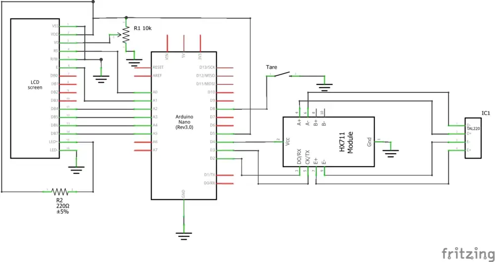- Note that the power for the HX711 and the LCD come from the digital pinouts on the Arduino. If issues arise with getting power to these, use the 5V pin instead.