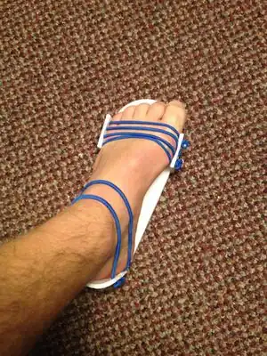Take the bungee cord and thread the hole directly above the current hole and create another loop ending with a knot on the 4th and final hole (20 minutes total to thread all holes). The entire process from tracing the foot to assembly took approximately 7 hours; 6 hours for printing and an hour for assembly. The completed assembled shoe should look as shown in the image.