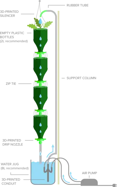 Using 3D-printed parts and recyclable bottles, 3Dponics created an open-source hydroponics system called 3Dponics, a 3D-printed hydroponics system that allows you to grow your own food, follow a healthy lifestyle, support local agriculture and do something good for the environment.