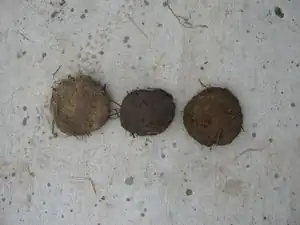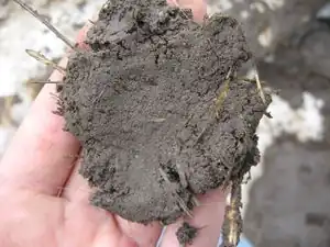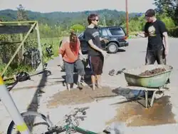 Cob is created by using a combination of compression and mixing. The way we decided to do this was we piled a mixture of two parts sand and one part clay onto a tarp. We than repeatedly stomped the mixture together with our feet, and rolled the tarp upon itself, making cigar shaped piles of clay and sand. Once the mixture was similar to coarse clay, we added straw to the mix and continued to roll and stomp. Once the consistency had changed from a dough like texture to that with much more plasticity, we added the straw and began forming bricks to add to our wall. If the mix is too dry and the straw does not take, this is the builders cue to add more water. If the mix is too wet, than the bricks will begin to sag to one side of the wall after they have been applied. This is the problem we repeatedly faced during this project because we live in such a wet community..[3]
