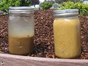 The jar on the left has settled out, and the jar on the right was recently shaken.
