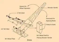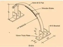 The braking system is used to control the speed of the trolley during landing at the down platform. This is done by applying force to the handle. Brake strips are connected to a fixed support at one end, and to the brake handle at the other end.