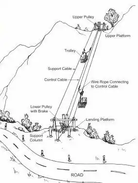 The gravity ropeway is an inexpensive and simple means of transportation. It operates by gravitational force without the use of external power. The gravity ropeway consists of two trolleys which roll on support tracks. These are attached to a control cable in the middle which moves in a traditional flywheel system. When the loaded trolley at the up-station is pulled downward by the force of gravity, the other trolley at the bottom-station is pulled up automatically by means of the control cable. In principal the goods coming downward from the up-station must to be thrice as heavy as the up-going load. The sliding down of the trolley and its speed depends upon the angle of elevation made by the cables installed with the horizontal ground.