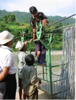 The improved tuin was developed and tested at the village of Mahestar (about 60 km west of Kathmandu). Based on the experience gained here, the design has been further developed into a double-cable design. Although costing more it provides better balance and can carry a greater load. Double-cable prototypes have been built in the villages of Kalleri, Pimaltar and Balkhu, in Nepal's Dhading district.