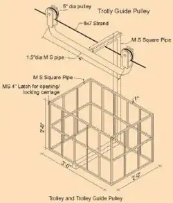 The trolley is made from mild steel (MS) pipes, and has a hanging trolley box where the load is placed. The flexible supporting hanger is connected to the guide pulley system. Its weight should be as light as possible – say, 30 kg. The center of gravity of the trolley should be wellbalanced during operation.