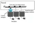 Del otro lado, se tendrán tres orificios, separados también por 1.45 metros y cerrados por ventosas conectadas por una palanca a un pedal en el suelo. La diferencia principal radicará en que no habrá un espacio para la caída de agua, sino que se colocarán tres pilares con una altura de 20 centímetros y un ancho y largo de 30 centímetros que servirán de soporte para poner recipientes como cántaros o cualquier otro con uso de almacenamiento de agua. Tampoco existirá dispensador de agua con jabón de este lado, será de uso exclusivo para recoger agua.