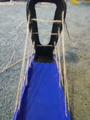Now use the 4' piece of string and string it directly horizontally across the leg part through the second to the top hole.