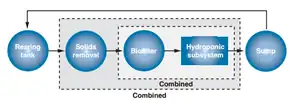 One of the noticeable features of the aquaponic system is the immense number of different ways it can be constructed. Despite this diversity there are five key components in any aquaponics set-up: rearing tank, solids removal, bio filter, hydroponics subsystem, and a sump (Fig.1;[5] These key components all accomplish the following functions, "finfish and plant production, removal of suspended solids, and bacterial nitrification.[1]