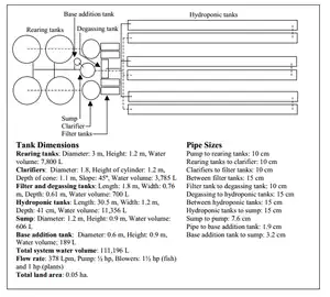 These intermediate filters help collect the solid and "facilitate conversion of ammonia and other waste products prior to deliver to hydroponic vegetables".[10] This comes into play in the commercial scale systems and clarifiers have been used (Fig. 2). The clarifier system collects solids at the bottom of the cone. It does require fish to be in the tank to feed on waste that might be near the top and keep the pipes clean. Netting is also set up after the clarifier to catch excess organic waste that has escaped the clarifier. This netting needs to be cleaned once to twice a week. It is important to remove these nets because a build up of organic material can lead to anaerobic conditions that can kill the fish.[5] Certain water quality parameters are required to raise fish and plants including a consistent pH, dissolved oxygen concentration, carbon dioxide, ammonia, chlorine, nitrite and nitrate.[10] The sludge collected off of the nets can be used to fertilize other crops, or in urban settings, can be used in wastewater treatment plants to clean water.[5] On a smaller scale system waste removal may be unnecessary (where there are small amounts of fish relative to the plant growing area).[5] In these systems, there is usually a direct flow of water from the fish-rearing tank to "gravel-cultured hydroponic vegetable beds".[10]