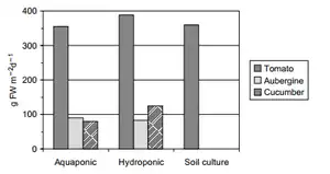 Another way to evaluate the system is to analyze the efficiency of nutrient removal by the plants. This has been done by many scientists. In one such experiment, scientists tested the nitrogen excretion and uptake in the aquaponic systems by looking at growth performance, lettuce yields and nutrient retention.[27] In another experiment, the aquaponic system was set-up to analyze the removal of nitrogen by tomatoes and cucumbers. It was found that the highest removal was by tomatoes and the overall system had "69% of the nitrogen removal by the overall system could thus be converted into edible fruits".[28] The yields of certain crops can also be used to evaluate the productivity of the system. In Graber et al. they analyzed four different tomato crops and found their yields to be higher in aquaponic when compared to hydroponic systems (Fig. 6).