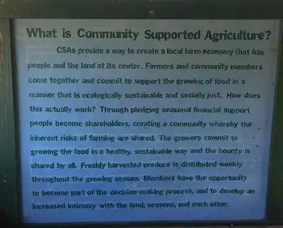 The Bayside Park Farm became the first CSA in Arcata and is funded to this day by the community; shareholders pledge their support in the spring and receive a share of the harvest every week for the growing season. As well as being a running CSA, the Bayside Park Farm is a permaculture park, demonstrating sustainable farming practices and appropriate means of energy use. Over the years, this farm has been managed by many generations of student farmers. Many notable farmers within the community learned how to farm here.