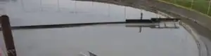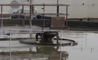 After spending 3.8 hours in the clarifier the effluent, water free of suspended solids, flows through a baffle and then through weirs at the edge of the tank. The baffle, which is essentially a wall partially submerged in the wastewater to prevent surface scum from flowing through the weirs with the effluent. The weirs, which have notches cut into them at regular intervals around the entire edge of the tank, allows the effluent to flow out of the tank at a constant even flow.[2] Because the flow through the weirs is the same around the whole tank, the effluent and the wastewater still in the tank is not disturbed, minimizing mixing and an increase in turbidity. After the effluent passes through the weirs, it flows into the effluent pipe and is transported to the oxidation ponds for further treatment.