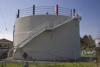 The purpose of an anaerobic digestor, shown in Figure 1, is to employ bacterial biological processes to consume organic matter in the absence of oxygen. In the case of the Arcata Wastewater Treatment Center, a digester is processing the raw sewage-sludge from the primary treatment. As wastewater passes through the Headworks and the Clarifiers (Figure 2)[1] settlable, organic material settles out and is sent to the digesters for processing. The water is diverted and goes on to the oxidation ponds.