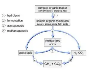 The anaerobic digestion of organic solids follows the steps shown in Figure 3.[2] The Figure describes the process organic solids go through to becoming end products of carbon dioxide (CO2), methane (CH4) and digested solid compost.