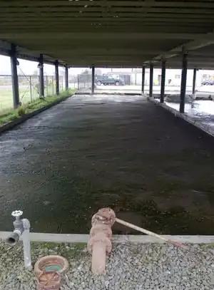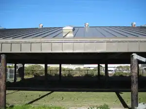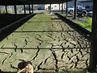 Biosoilds are poured into drying beds which are a set of two rectangular cement floored holding areas that have drains. To get an idea of how large they are, look at (Figure 2.b) and compare the bed to the Ford truck in the background. It is in the drying beds that evaporation and transpiration (evapotranspiration) act as the drying mechanism of the biosolids.[8] The hotter and sunnier the year is, the faster the biosolids harden into a dirt-like consistency. Built above the drying beds is a metal roof with air vents and skylights, viewable in (Figure 2.d). Because Arcata gets rain for a majority of the year, this roof helps the biosolids from getting watered down or inundated. Drying can take anywhere between six months to one year. Each year at Arcata Waste Water Treatment Plant two dry beds of biosolids are generated (Figure 2.c).