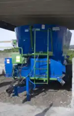 In order for composting of the biosolid to take place, a bulking agent is added to allow for aeration, porosity, and proper carbon to nitrogen nutrient balance.[9] The composting facility uses wood chips, grass clippings, and hydrocotyl from the oxidation ponds to provide this function. Operators mix a 3:1 volume ratio of woodchips to biosolids in a double auger vertical mixing wagon (Figure 3) and dump the mixture into long, six to eight feet high compost piles.[1]