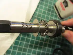 Add the nylon bushing(the white, large looking washer) on to the feed screw after the last race. It should look like this.