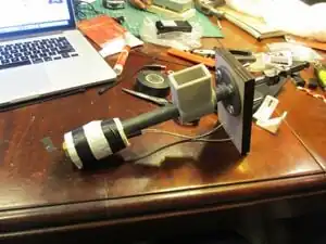 Attach the fan to the small piece of wood and then screw that the board as well right under the end of the barrel.