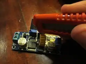 Look for the two blue boxes on the top of the board with two little screws on top. Look carefully under the boxes to see which is CV and which is CC. Rotate the CV screw counter-clockwise till you hear a click (a few dozen rotations). Once it clicks rotate it clockwise for 15 rotations. Do the same with the CC screw but only rotate it clockwise for 6 rotations.