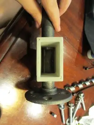 Put the feed screw into the barrel. Place the wood so that the end of the feed screw comes out of the hole. Take the four bolts add a washer to each and put them through the small holes in the nipple connected to the barrel and the small holes in the wood so that the washer is flush with the nipple and the extra is coming out of the wood holes. You may need to people for this step one person to hold the bolts in place and the other to add components. Now add a spacer to each bolt. Add the second nipple so that the flat side is facing the wood. Finish by adding a washer and nut to each bolt and tightening by hand. Check to see if about 1/4in of the feed screw sticks out of the barrel, if not you need to take it apart and adjust the location of the shaft collar.
