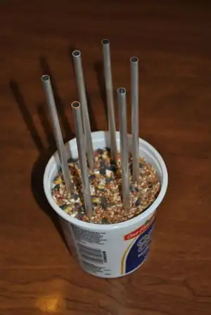 - The tubes must stand upright while epoxy cures. Find a suitably tall container and fill with a dry, granular material like bird seed or rice.Container with dry granular material to stand tubes in.