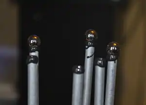 - Carefully dip one part of a ball bearing in the epoxy and place the wetted portion on one of the wetted aluminum tubes. Repeat with five more bearings. Unless there's a terrible mess, don't try to clean up excess epoxy - it can be removed with a sharp knife after it cures.Epoxying the ball bearings to the aluminum tube.
