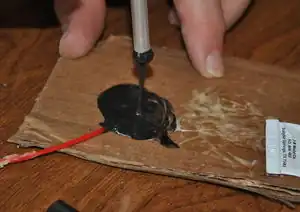- With the epoxy mixing stick, carefully push the epoxy up onto the ball bearing while rotating the tube in the holder. This helps to maximize the surface area in contact with epoxy, making a stronger joint.Maximize contact area.