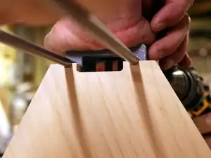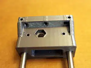- A friend is useful for this step as well (and generally are in other areas in life). Carefully lay the assembly on its side and position the hexagonal base such that the guide rods rest in their reliefs cut in the base (see picture). Firmly push the guide rods into their reliefs and attach the base with a pair of #6 x 3/4" sheet metal screws. Rotate the assembly and repeat with remaining sides.Attach the hexagonal base.