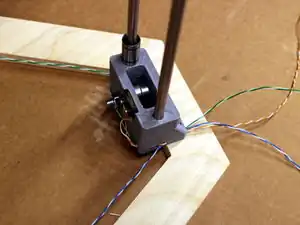 - All of the limit switch wires will run down one of the apexes. There are small holes in the tops of the idler ends through which the limit switch wires are run. Route the wires from two of the apexes to the third such that they neatly meet at the hole exiting the top, right of the third idler end (see picture). The holes are small; when running all three through the last one, pull one pair at a time and with the last wire, pull the previous two towards the interior and then use them to help the third pair through.Route the limit switch wires.