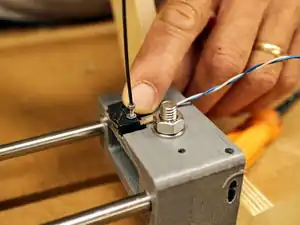 - With the tip of the precision knife, ream the small holes in the idler ends where the screws secure the limit switches. This makes starting the screws much easier, but don't get carried away. Prepare six M2 x 12 mm socket head cap screws with M2 flat washers on them. The limit switches are both screwed and epoxied to the idler ends, so having the screws ready to go helps since celerity is required to get the switches in place before the epoxy cures. Note that the switches are positioned such that the tab is facing the nearest guide rod (see picture). Mix a small amount of plastic epoxy and smear a thin layer on the side of the switch mating with the idler end. Secure the epoxied switch in place with a pair of M2 screws.Attach limit switches.