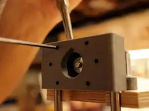 - Use a thin tool (2.5mm allen wrench or small screwdriver) to better align the washer/bearing cartridge. When they are reasonably well aligned, carefully insert the 8mm drill bit to finalize alignment. Push a M8 x 40mm bolt through the assembly from the exterior side of the idler end. Secure in place with a M8 flat washer and M8 nut. Repeat with remaining two idler ends.Align idlers and secure in place with M8 x 40mm bolt.