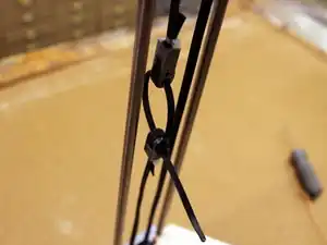 - Rotate the frame such that you're looking at one of the apexes across the interior of the frame. Start a large wire tie through the fixed belt terminator and then back into the interior of the frame through the free belt terminator. Secure the wire tie and use a needlenose pliers or lineman's pliers to pull the wire tie until the belt twangs when plucked (regular pliers tend to cut through the wire tie with potentially catastrophic consequence).Tighten belts.