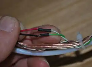 - Note the color of the 24ga wire soldered to the red (POSITIVE) wire of the end effector cooling fan.Note the color of the 24ga wire soldered to the red (POSITIVE) wire of the fan - brown-white in this picture.