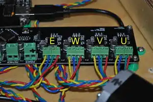 - Wire the motors as shown in the image, wiring the drive motors for U, V and W to X-MOTOR, Y-MOTOR and Z-MOTOR, respectively (see photo - note that connecting two motors to the wrong terminals will result in mirrored prints). The extruder motor is likewise connected to the controller to the terminal marked E-MOTOR. If motor leads are colored differently than shown, identify connected pairs of motor wires by touching the conductors together and noting if additional force is required to rotate the motor shaft. Wire pairs that increase resistance to rotation should occupy adjacent terminals (e.g. the pairs shown in the picture are red-green and blue-yellow).Follow the wiring carefully - click on picture to zoom in.