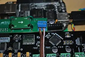 - Polarity matters! Reversing polarity at this step will likely result in destruction of the Beaglebone upon application of power. Attach the 15cm (6") long speaker cable to the bridge board screw terminal nearest the screw terminals on the Melzi (see photo) taking note of the markings on the conductors and which terminal (positive or negative) each conductor is attached to. Tighten the screws.Attach power cable to bridge board - POLARITY MATTERS!.
