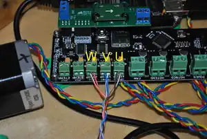 - Connect the limit switch conductors to their respective axes e.g. the limit switch above the U motor is attached to the U limit switch (marked XSTOP), etc. There is no polarity concern.Connect limit switches.