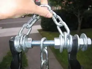 Then a safety chain was added from the shaft of the bolt to the brace of the frame (figure 1). The chain is held in place by a bolt screwed through the brace. Rubber washers were placed between the brace and the chain, and then a washer and then a nut were added to secure it in place (figure 1).