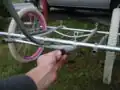 Side attachment or seat-post attachment? That is the question. This trailer attaches at the seat-post. Victor of the amazing HSU Bicycle Learning Center says that the side attachment system tows more nicely. You can choose to do either, just keep your turning radius in mind when bending the tongue. I'll make another prototype trailer with a side attachment and post the direction on this page sometime in the future.