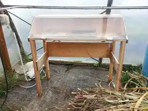 Plexiglass and hinges attached.- Our finished dehydrator, with garbage-bag absorber.
