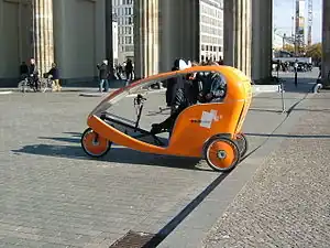 In 1997, Berlin-made cycle rickshaws called velotaxis were created. The tickets are about one half the cost of regular taxis. Velotaxis are three-wheeled vehicles with a "space-age lightweight plastic cab that is open on both sides", a space for a driver, and behind the driver, space for two passengers. They have been invented by Ludger Matuszewski, the founder of "Velotaxi GmbH" company.