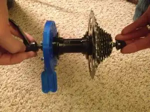 - Attach the base to the hub using the wood screws, sending them through where the spokes normally go.