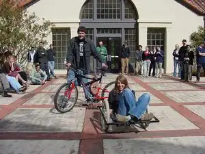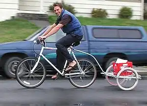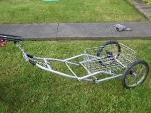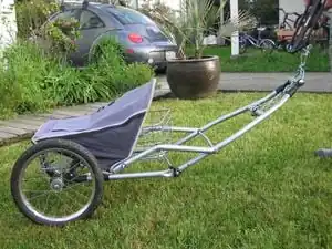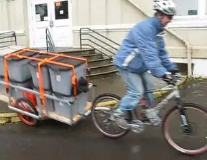 A bicycle trailer is a motorless wheeled frame with a hitch system for transporting cargo by bicycle. It can greatly increase a bike's cargo capacity, allowing point-to-point haulage of objects up to 3 cubic metres (3000 liters, or 4 cubic yards) in volume that weigh as much as 500 kg. However, very heavily loaded trailers may pose a danger to the cyclist and others, and the voluntary European standard EN 15918 therefore suggests a maximum load of 60 kg on trailers without brakes.