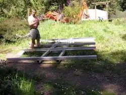 While the concrete was setting up we built the rack which came ready to assemble and was very easy to put together. It consists of a central bracket that sits on top of the post that acts as a pivot point, and lateral bars that the panels connect to. Once it was assembled on the ground we lifted it up and set it on top of the post.