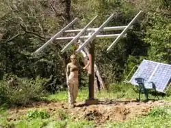 - First we had to dig a hole deep enough to support the stand. Due to the size of the array, this hole had to be five feet deep. We dug the hole with Daniel's tractor, which is run off bio-diesel. (See Fig 1 and 2)