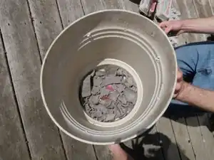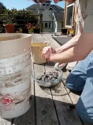Place a thin layer of bedding in the base of your top bucket. This will lay over the holes that you drilled in step 2. The bedding will be home for your worms. Fluff the bedding as you add it- do not pack it in tight. Your worms will need some space to crawl around!