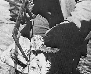 To remove the brains, split open the head from the eyes to the nose with an ax. Chop through the hide and all the way through the skull. Then reach in and pull out the brains.
