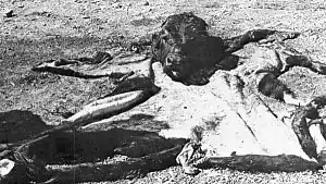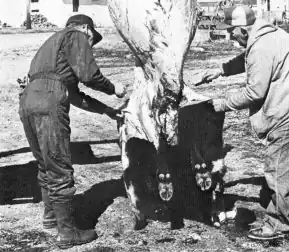 After shooting the animal through the head, quickly bleed it. It is important to bleed the beef as soon as possible, since quick and thorough bleeding results in better tasting meat. To bleed the calf, with a butcher knife, slit the throat horizontally (photo 1) until a constant blood flow begins. Allow the blood to drain thoroughly.