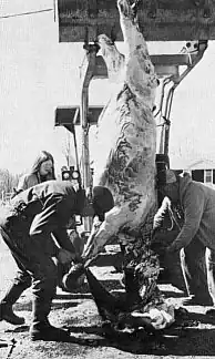 Photo 4--Farrell Burns and Allen Sharp begin to skin the beef starting with the legs.