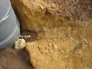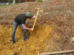 - 9/26/08 - We began the project. We started pick-axing and shoveling clay to cut a garden bed into the slope. We got a lot of work done with the help of the class. It was mostly filling the tires and shoveling clay out of the way.