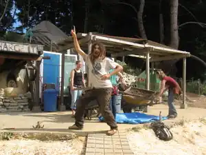 - 10/29/08 - Last day of work. Secured log retaining wall with wire and screws. Made a gravel walkway along herb bed. We finished the earthship retaining wall, that is also part of a garden bed for herbs. Decorative plants can be grown in the soil inside the tires in the earthship wall. CCAT is building a rainwater catchment system and we incorporated the tank into our wall. The herbs when they are planted will have water conveniently available. Yay!